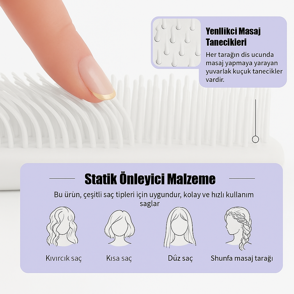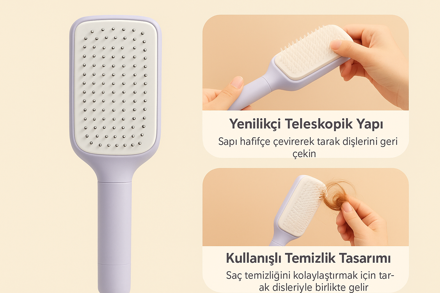 Sapı, tarak içindeki saçları geri çekmek için döner, böylece saçları temizlemek ve tarağı hijyenik tutmak çok kolay hale gelir.